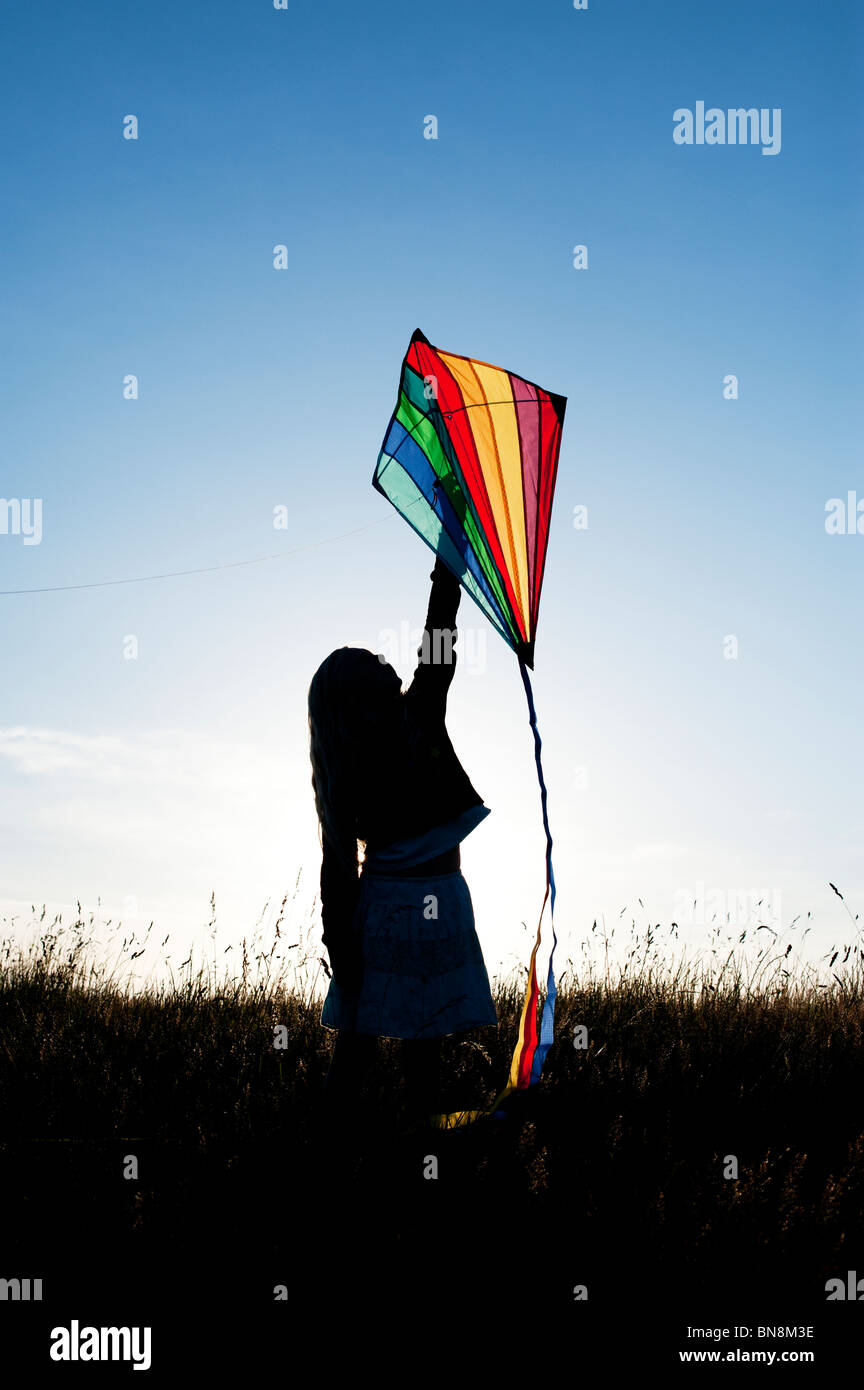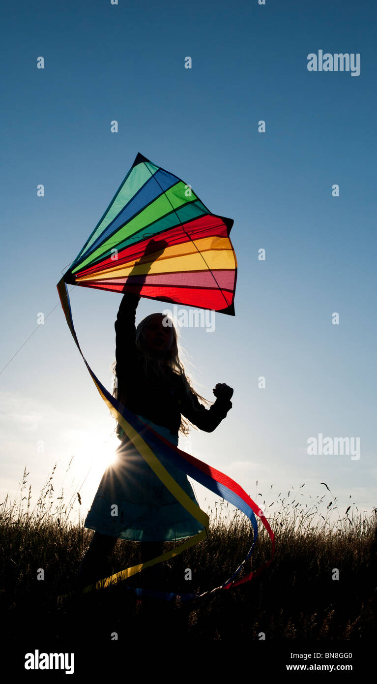 Ragazza Giovane Avendo Divertimento Volare Un Aquilone Multicolore Nella Campagna Inglese Silhouette Foto Stock Alamy
