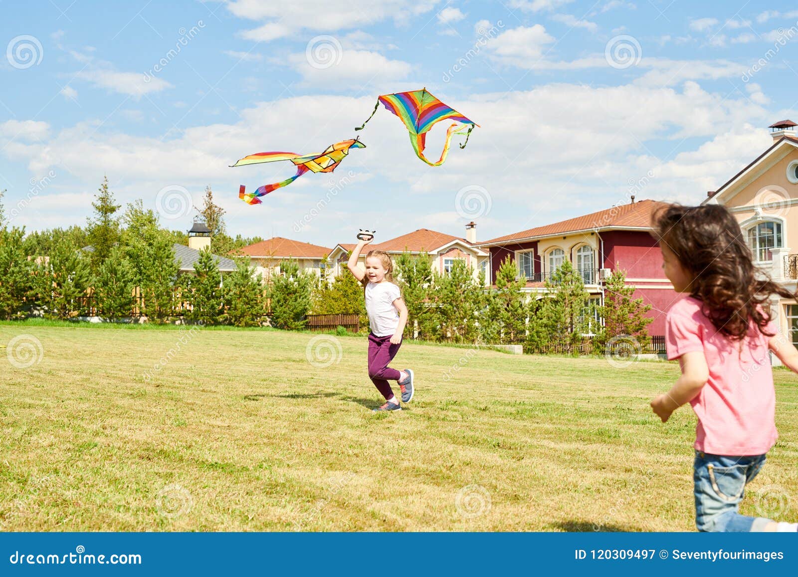 Due Ragazze Che Corrono Con L Aquilone Immagine Stock Immagine Di Kite Felicit