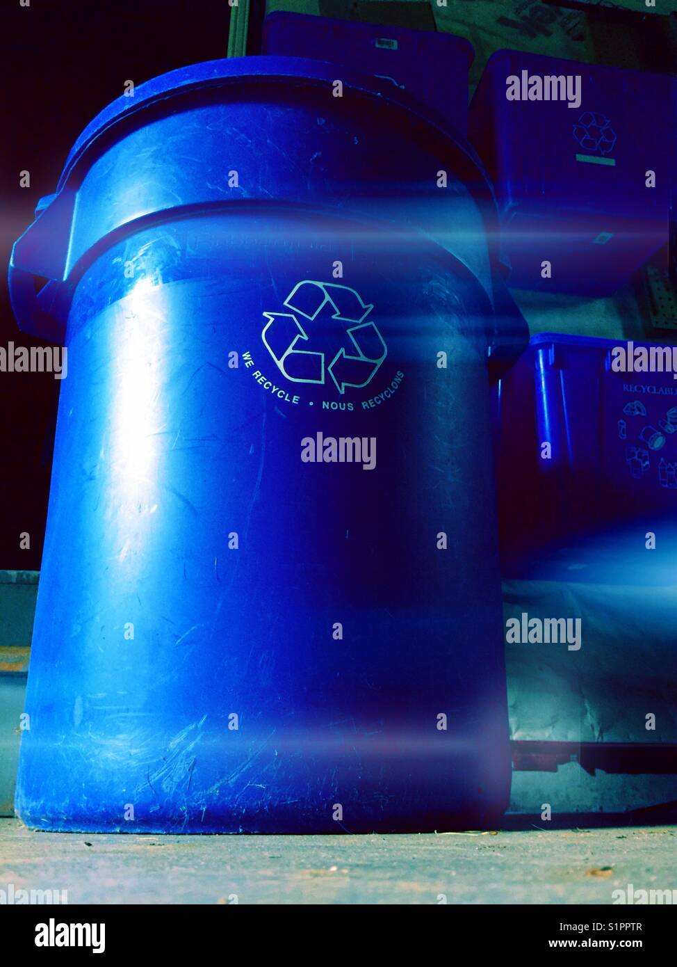 Grande Contenitore Di Riciclaggio Su Un Pavimento Garage Che Dice Ricicliamo In Inglese Ed In Francese Nous Recyclons Con Scatole Di Riciclaggio In Background Foto Stock Alamy