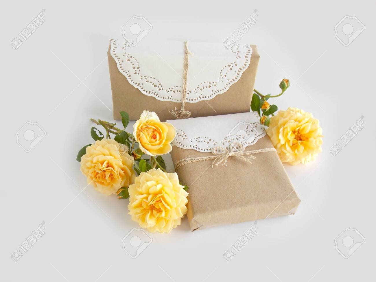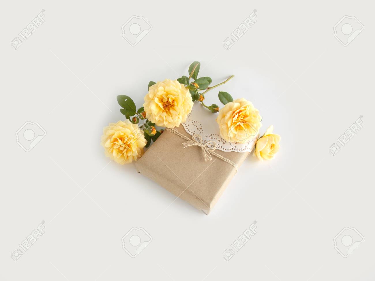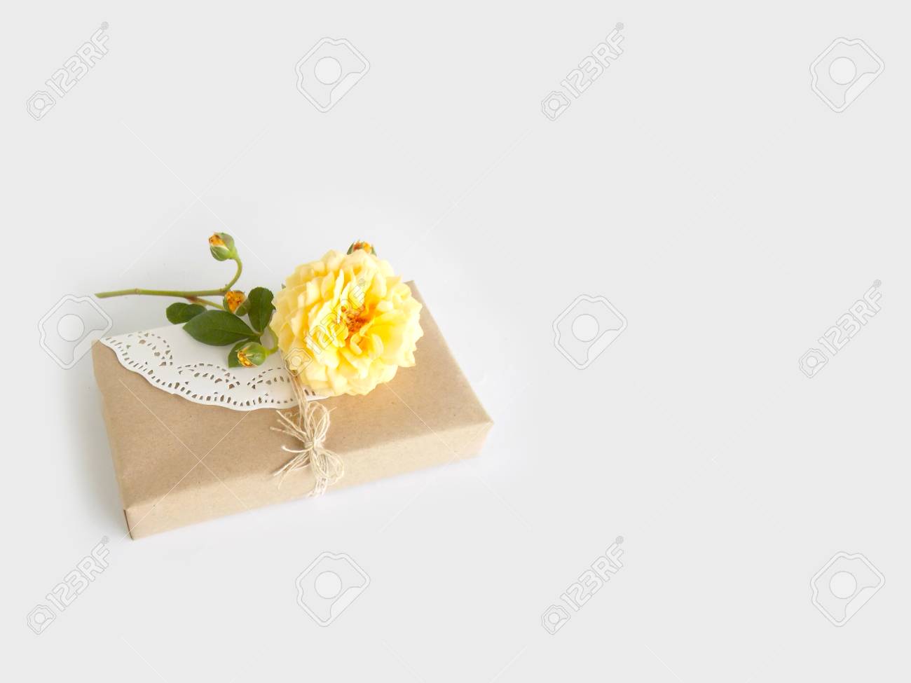 Immagini Stock Il Contenitore Di Regalo Con L Inglese Giallo E Aumentato Su Priorita Bassa Bianca Image