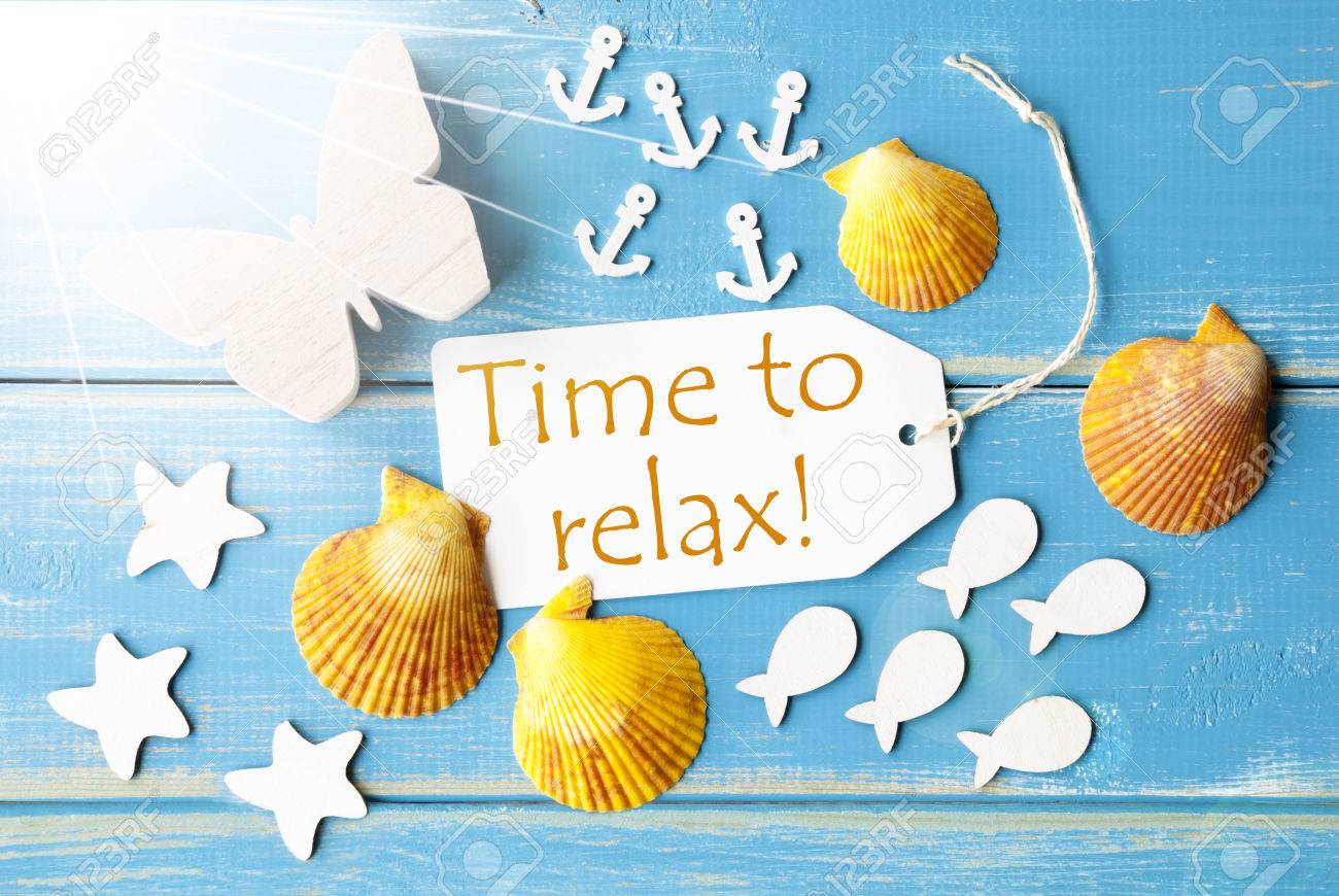 Immagini Stock Planarita Vista Di Etichetta Con Tempo Inglese Testo Per Rilassarsi Soleggiato Greeting Card Estate Farfalla Conchiglie E Pesci Su Sfondo Blu In Legno Image