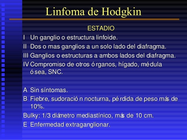 A Grado II masivo — grado II como más arriba y una alteración ganglionar voluminosa (bulky), es decir una alteración ganglionar aislada de ≥10 cm de diámetro o que presenta >1/3 del ensanchamiento mediastínico valorado por TC a cada nivel de la columna vertebral torácica A partir de J Clin Oncol, 14;. 7 3941 apariencia de los ganglios linfáticos y células) y el LH con compromiso linfocítico nodular (3) La estadificación de los linfomas describe la extensión o esparcimiento del tu. A ó B fiebre, sudoración nocturna, pérdida de peso superior al 10% del peso corporal en los seis meses previos X enfermedad voluminosa (bulky) ensanchamiento mediastínico >1/3 del diámetro transversal interno del tórax medido a nivel de T56, o masa >10cm.