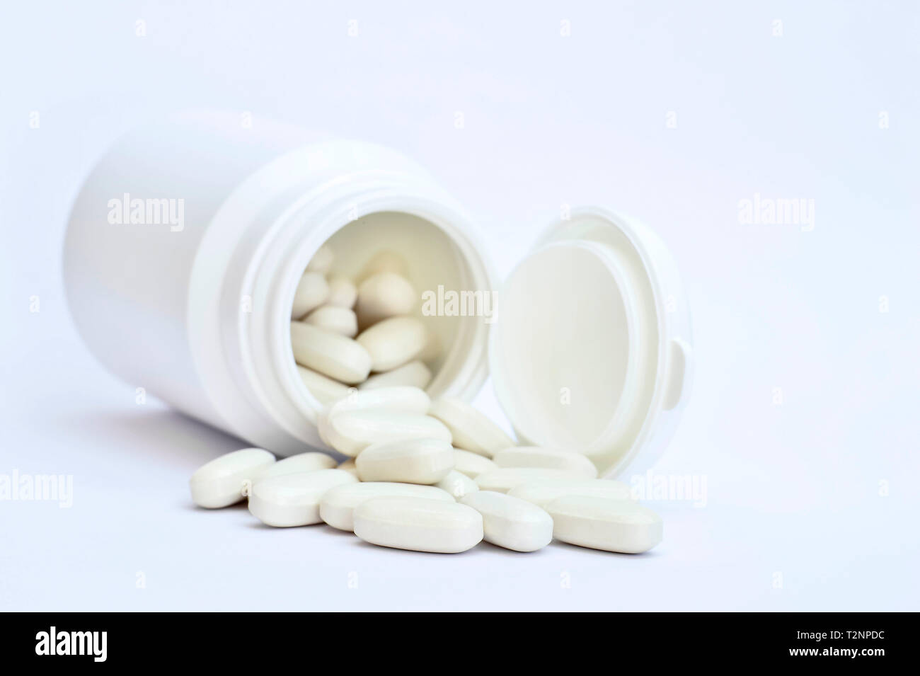 Bianco Pillole Ovale Versato All Esterno Della Bottiglia Bianca Su Sfondo Bianco Il Concetto Della Necessita Per L Uso Di Farmaci A Pazienti Foto Stock Alamy