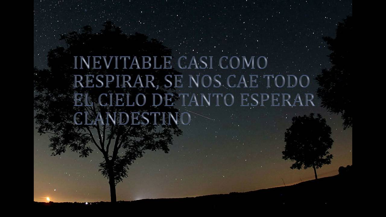 Mi amor clandestino en el silencio o el dolor se nos cae todo el cielo de esperar inevitable casi como respirar se nos cae todo el cielo de tanto esperar Clandestino No te engañes mas ya no te mientas si aire ya paso, ya paso y verdad, ya no tengas miedo solo tu mantienes mi respiración Clandestino. Eres inevitable amor Casi como respirar Casi como respirar Llegué a tus playas impuntual, pero no me rendiré Soy tu amor clandestino Soy el viento sin destino Que se cuela en tus faldas mi amor Un soñador, un clandestino Que se juega hasta la vida mi amor Clandestino Amada, amada amor No, no, no, no Mi amor clandestino en el silencio el dolor Se nos cae todo el cielo de esperar Inevitable. D A Bm Eres inevitable amor G D casi como respirar A Bm G casi como respirar D A Bm llegue a tus playas impuntual G D pero no me rendiré A Bm G soy tu amor clandestino D A Soy el viento sin destino Bm G que se cuela en tus faldas mi amor D A un soñador un clandestino Bm G que se juega hasta al vida mi amor D A Bm G Clandestino D A Bm amad, amad, amor G A No, no no no.