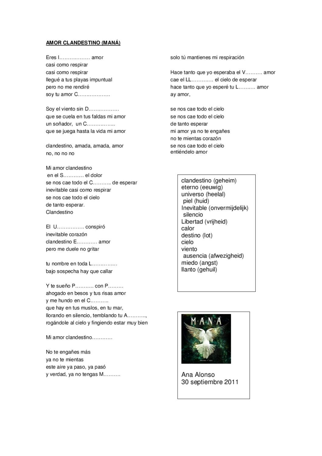 See a recent post on Tumblr from @eldiariodeashleyclark about amorclandestino Discover more posts about amorclandestino. Maná Amor clandestino lyrics Eres inevitable Amor, / casi como respirar / casi como respirar / Lleg Deutsch English Español Français Hungarian Italiano Nederlands Polski Português (Brasil) Română Svenska Türkçe Ελληνικά Български Русский Српски العربية فارسی 日本語 한국어. Ama ama amor No no no no Mi amor clandestino en el silencio el dolor Se nos cae todo el cielo de esperar Inevitable casi como respirar Se nos cae todo el cielo De tanto esperar clandestino El universo conspiro inevitable Corazón clandestino entre el amor Pero me duele no gritar tu nombre Todo libertad bajo sospecha hay que callar Y te sueño piel con piel Ahogado en besos y tus risas amor.