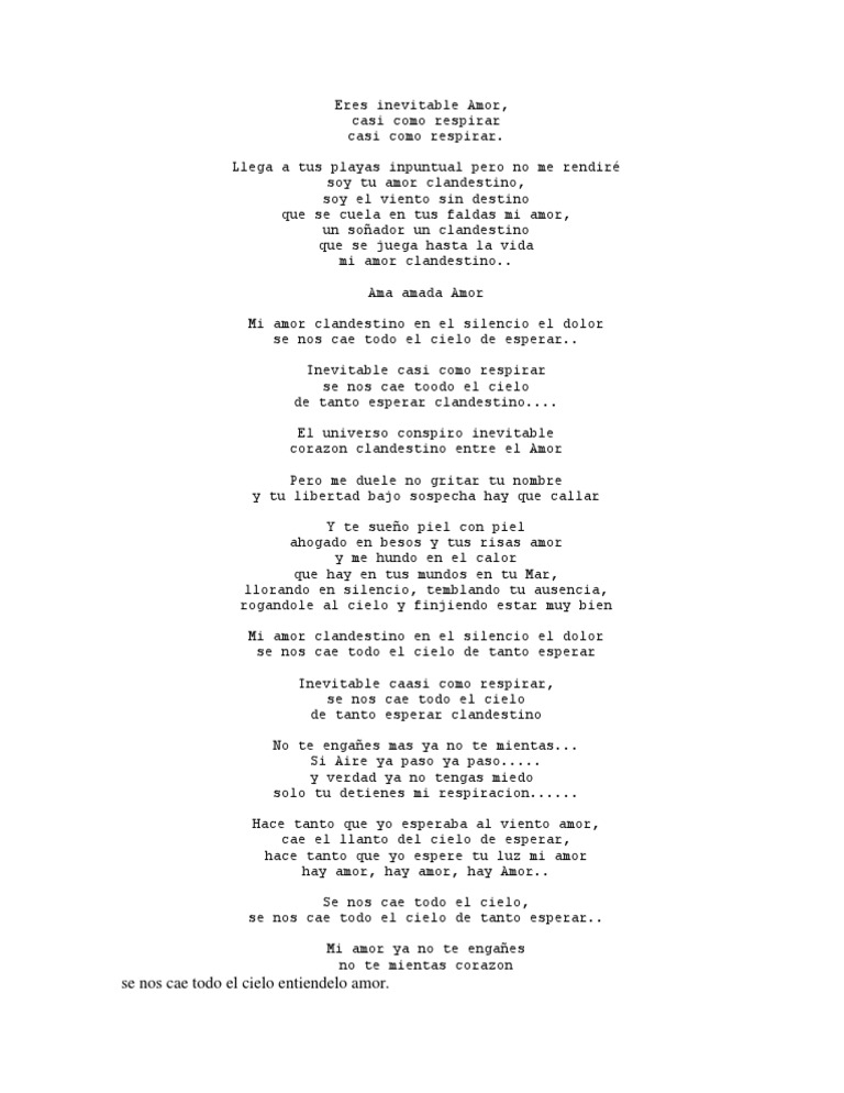 Maná, Eres inevitable amor, Casi como respirar, Casi como respirar, Llega tus playas impuntual pero no me rendiré, Soy tu amor clandestino, Soy el viento sin destino, Que se cuela en tus faldas mi amor, Un soñador un clandestino, Que se juega hasta la vida, Mi amor clandestino, Ama ama amor, No no no no, Mi amor clandestino en el silencio el dolor, Se nos cae todo el cielo de esperar. Amore Clandestino 74 likes Per chi,come noi,vorrebbe stare con la persona amata ma non puo'.