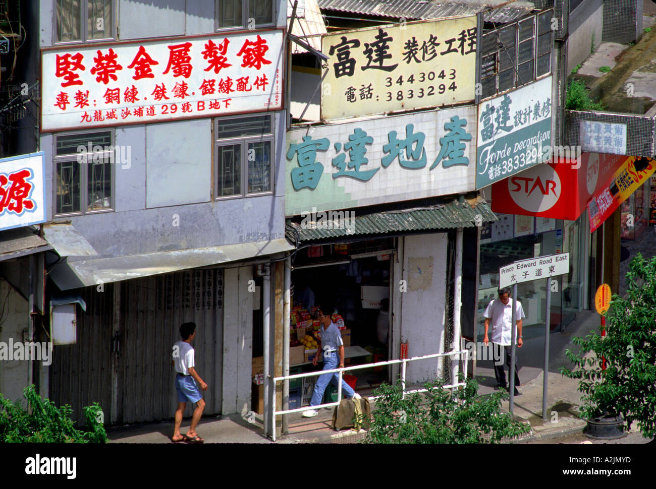 Negozi Cinesi E In Inglese I Nomi Delle Strade Vicino Al Vecchio Aeroporto Di Kai Tak Foto Stock Alamy