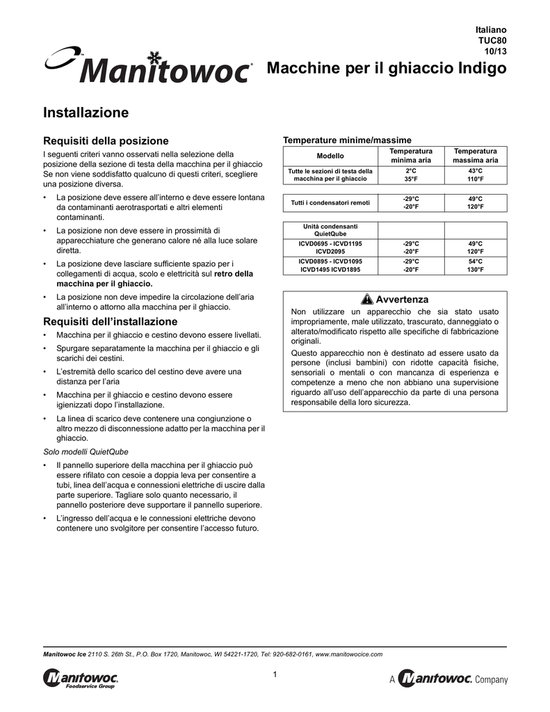 Manitowoc Macchine Per Il Ghiaccio Indigo Installazione Requisiti Della Posizione Manualzz