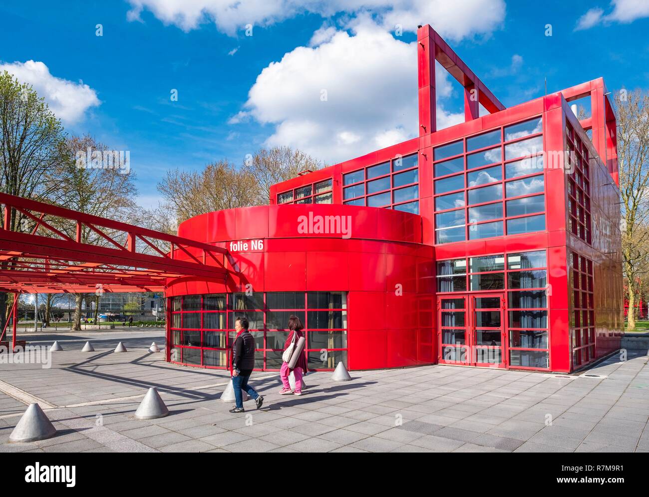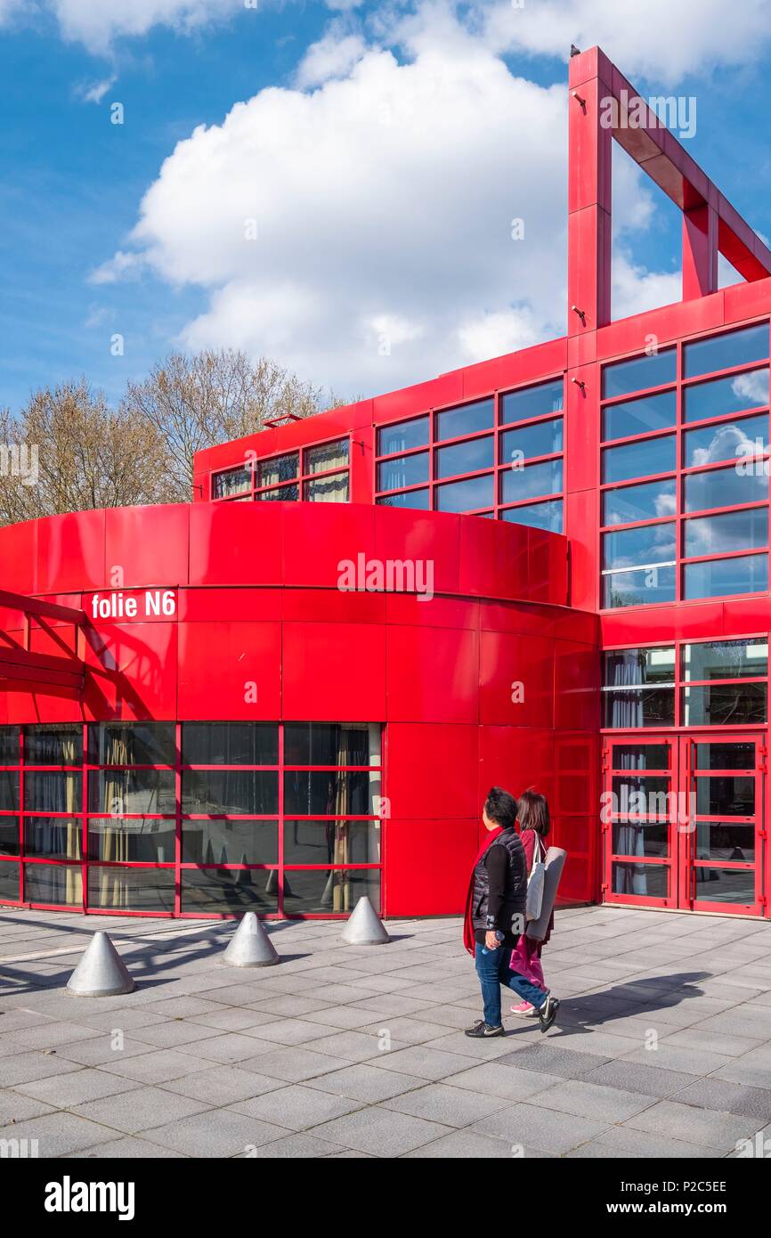 France Paris Parc De La Villette Les Folies 26 Batiments Rouges Qui Permettent De Creer Des Evenements Dans Le Cœur Du Parc Et Concu Par Bernard Tschumi Photo Stock Alamy