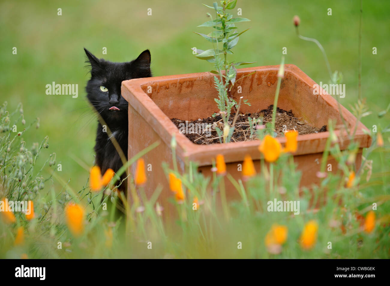 Un Gatto Nero Dietro Un Vaso In Un Panno Umido Giardino Inglese Uk Foto Stock Alamy