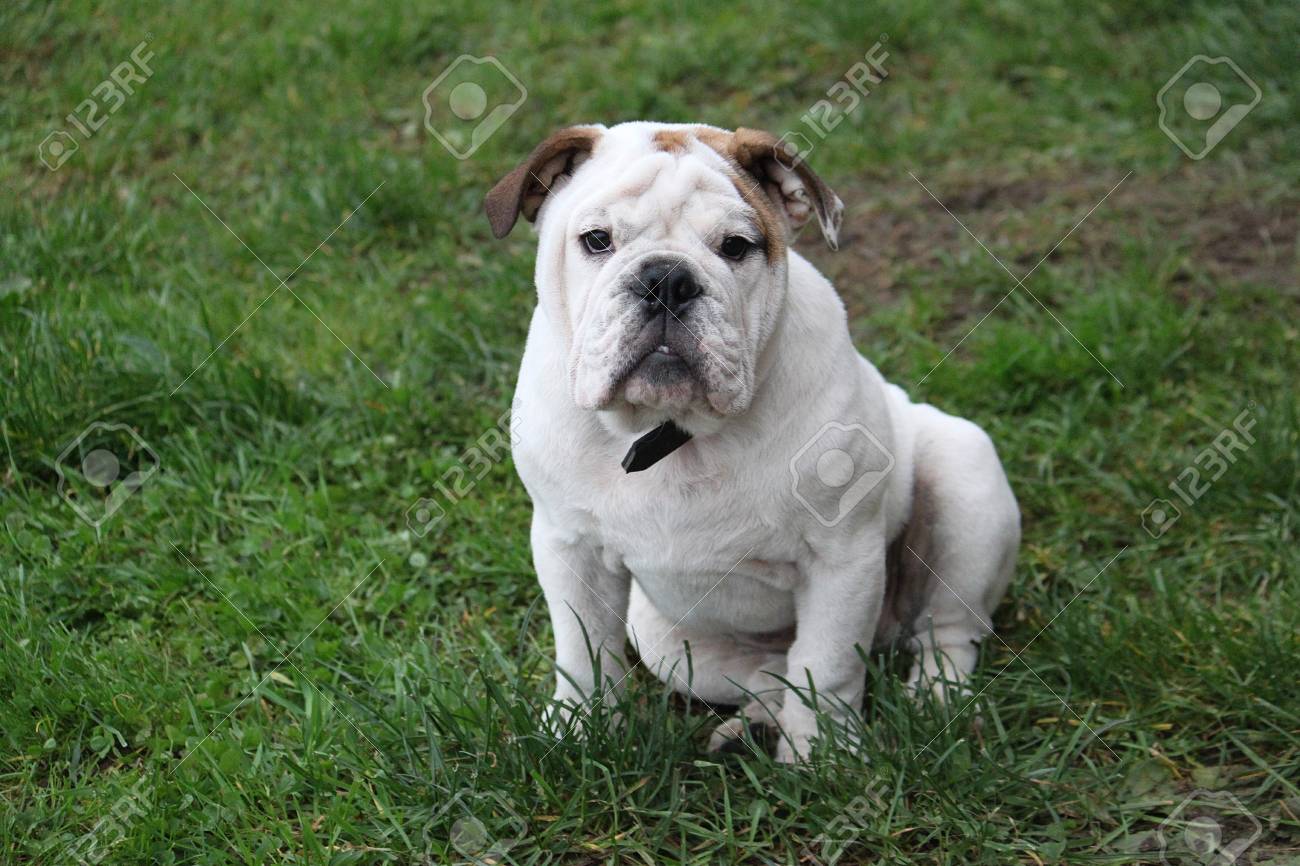Immagini Stock Bulldog Inglese E Seduto In Giardino Image