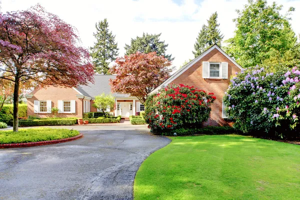 Bello Appello Del Bordo Della Casa Con Mattoni A Vista Con Prato Inglese Ben Tenuto E Degli Alberi Rossi Nel Giardino Anteriore Immagine Stock Immagine Di Garage Northwest