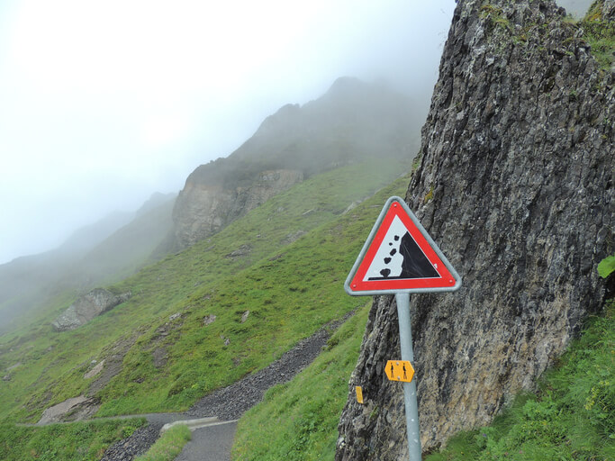 TPAT2 Segnali di pericolo (Elementi (Caduta massi da sinistra, Caduta TPAT2 Segnali di pericolo. Anche perché quello del Ritzlihorn è solo uno dei 32 siti potenziali del canton Berna in cui sussiste un pericolo di caduta di massi, secondo uno studio The Ritzlihorn up above is just one of 32 potential sites in canton Berne where there is a hazard of a rock fall , according to one study. Presegnala la presenza di pietrisco, di materiale minuto o granaglia che può essere proiettato a distanza o scagliato in aria dai veicoli in transito 100px Caduta massi da destra Presegnala il pericolo di caduta massi dalla parete rocciosa di destra con possibile presenza di pietre sulla carreggiata 100px Caduta massi da sinistra.