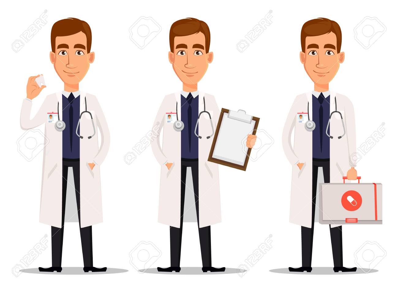 Jovem Profissional Medico Conjunto Com Modelo De Dente Com Prancheta E Com Kit De Primeiros Socorros Medico Assistente Equipe Hospitalar Personagem De Desenho Animado No Fundo Branco Ilustracao Vetorial Ilustraciones Vectoriales Clip