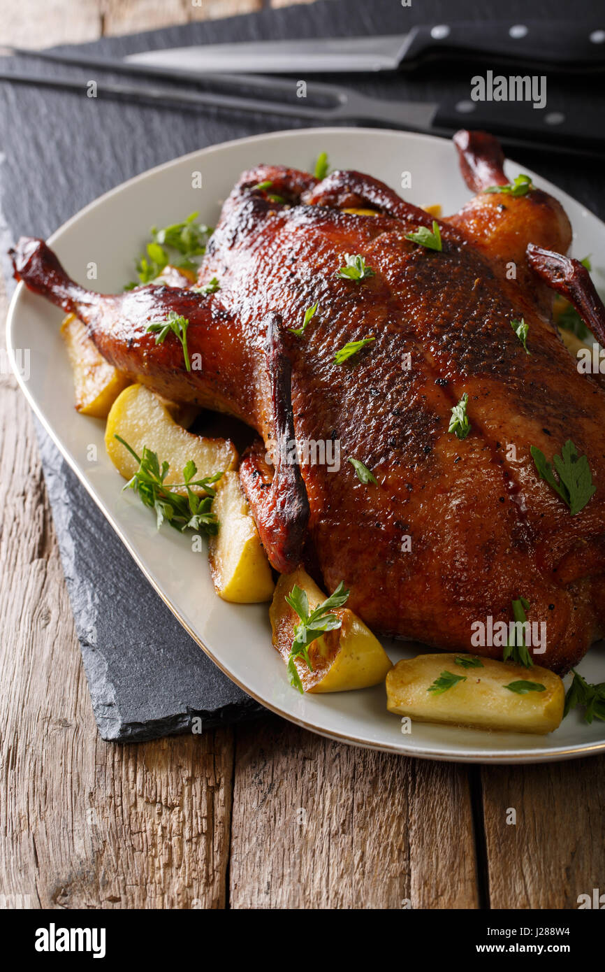 Deliziosa Tutta L Anatra Al Forno Con Mele Close Up Su Un Piatto Da Portata Sul Piano Verticale Foto Stock Alamy