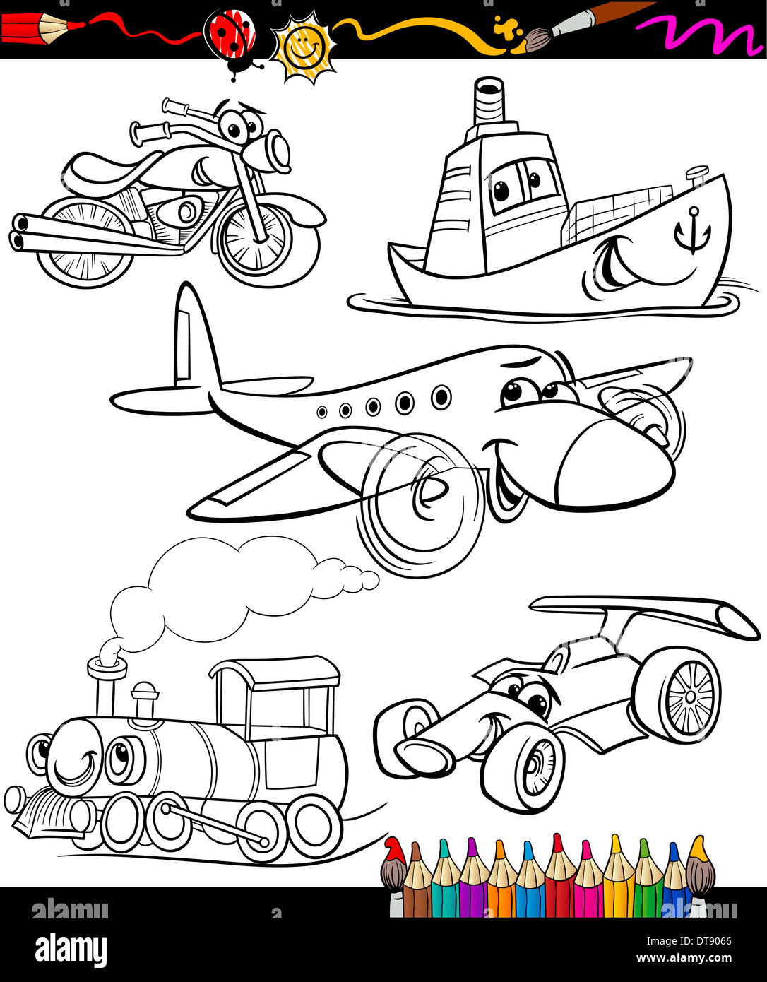 Libro Da Colorare O Pagina Cartoon Illustrazione Set Di Nero E Di Bianco O Di Trasporto Veicoli Caratteri Per I Bambini Foto Stock Alamy