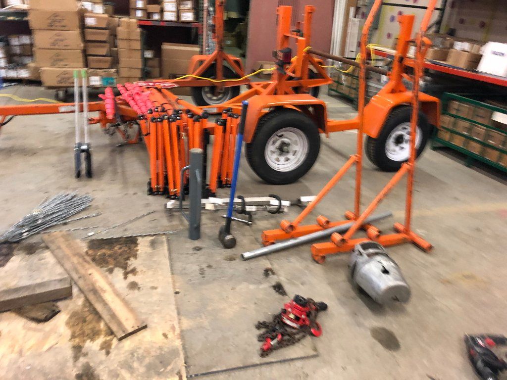 Cable reel trailer. 10K Auto Locking Cable Reel Trailer, Built with safety in mind, our auto locking reel trailers latch and clamp the bar simply by applying hydraulic pressure with the pumps. These cable & duct reel trailers are perfect for transporting conduit, inner duct and all types of reel mounted material. Overhead Cable Guide Removable overhead guide for use in paying out wire from multiple reels Stainless steel and bronze couplers with easy removable pins and mounting Mounts to receivers provided with trailer Specify (1) per reel station Gallery home Phone (630) 10 North Sauber Road Virgil, IL.