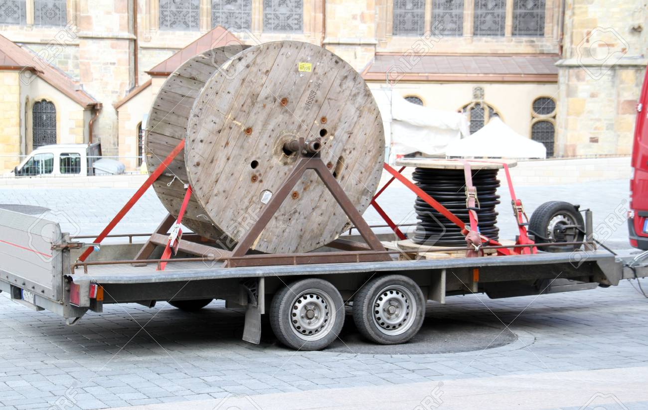 Car Trailer Belseden With Large Cable Reel Made Of Wood Stock Photo Picture And Royalty Free Image Image