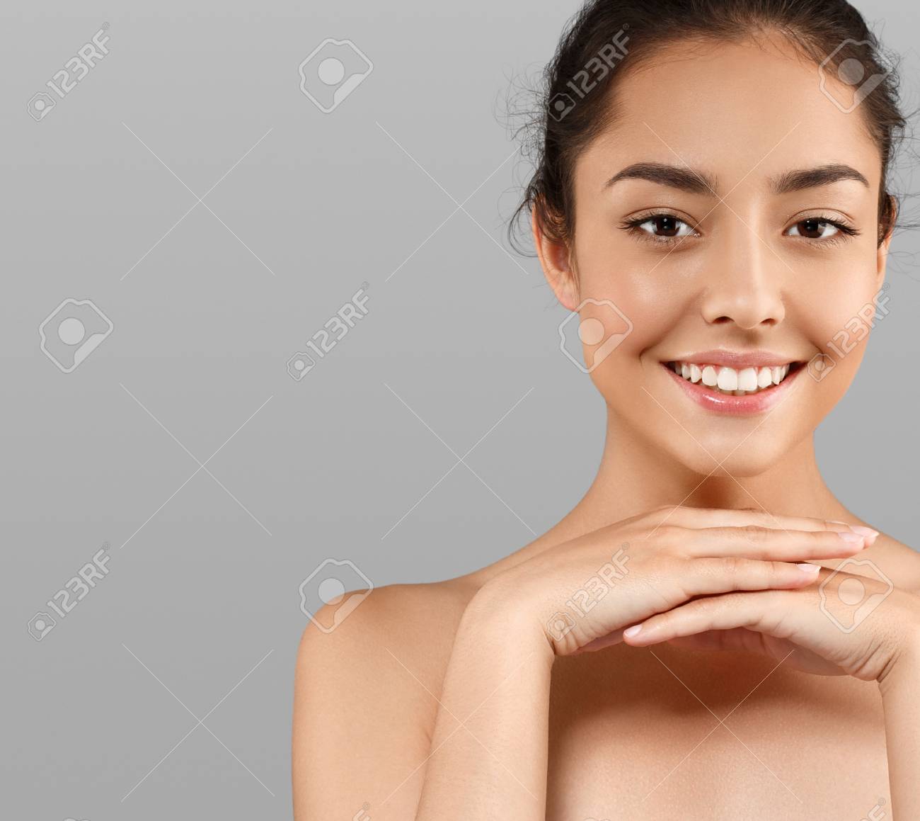 Immagini Stock Bello Fronte Di Giovane Donna Modello Con Pelle Pulita Fresca Sana Perfetto Eta E La Salute Concetto Bellezza Donna Ritratto Isolato Su Sfondo Grigio Image