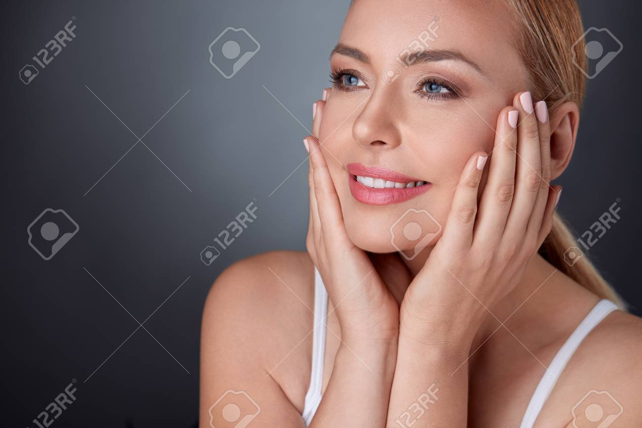 Immagini Stock Attraente Donna Di Mezza Eta Soddisfatta Della Sua Pelle Pulita E Perfetta Image