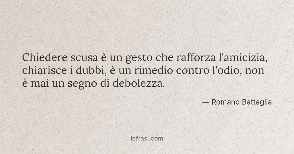 Chiedere scusa è un gesto che rafforza l'amicizia, chiarisce i dubbi, è un rimedio contro l'odio, non è mai un segno di debolezza Frase di Romano Battaglia Pics Metti nelle Preferite Spedisci frase Facebook Whatsapp Perdona gli altri, non perché essi meritano il perdono, ma perché tu meriti la pace. Chiedere scusa è un gesto che rafforza l'amicizia, chiarisce i dubbi, è un rimedio contro l'odio, non è mai un segno di debolezza Romano Battaglia. "Chiedere scusa è un gesto che rafforza l’amicizia, chiarisce i dubbi, è un rimedio contro l’odio, non è mai un segno di debolezza'' (Romano Battaglia) "Il perdono non cambia il passato.