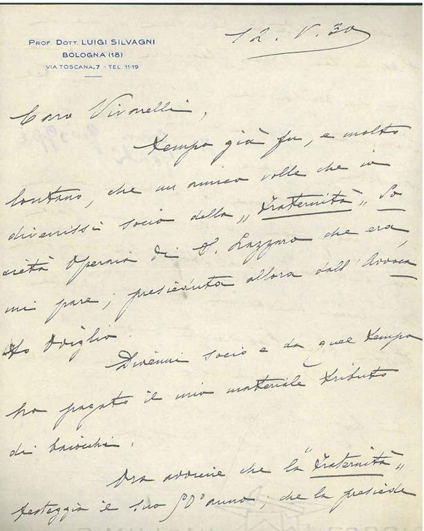 Lettera Su Carta Intestata Prof Dott Luigi Silvagni Bologna E Datata 12 V 30 Da Silvagni Luigi Medico 1864 1946 1930 Studio Bibliografico Orfeo Alai Ilab