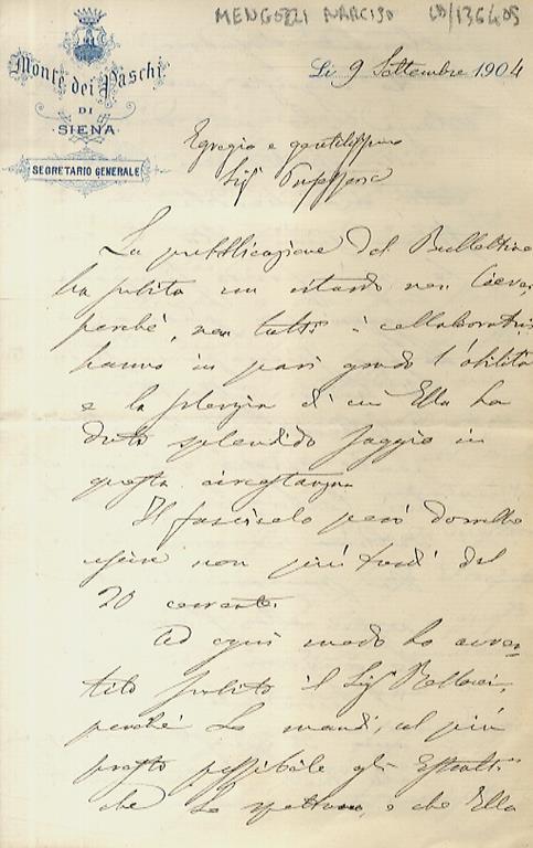 Lettera Manoscritta Autografa Firmata Stesa Su Quattro Facciate Su Carta Intestata Monte Dei Paschi Di Siena