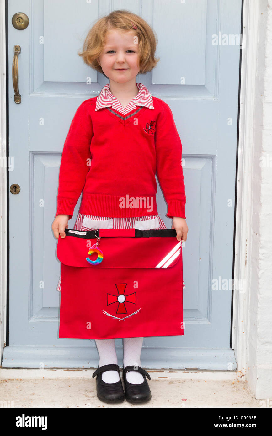Quattro Anni Di Schoolgirl School Girl Bambino Kid Nella Nuova Uniforme Al Suo Sportello Anteriore Di