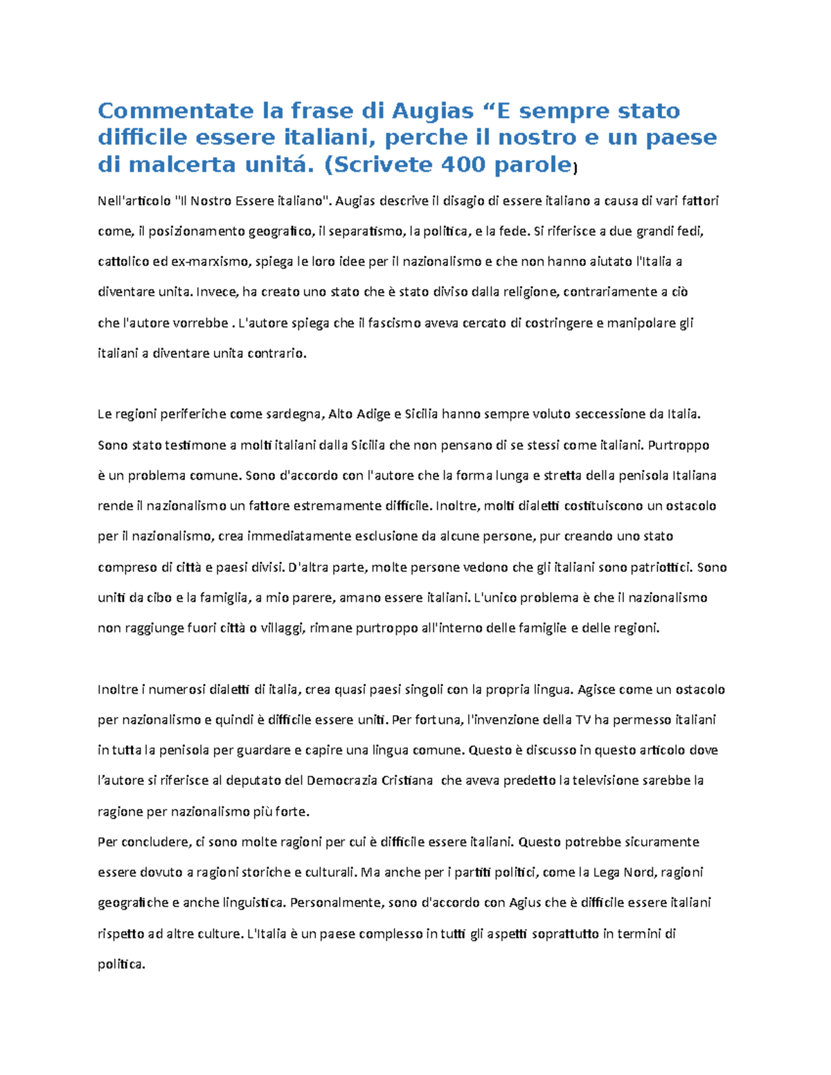 Essay Commentate La Frase Di Augias Essere Italiano Studocu
