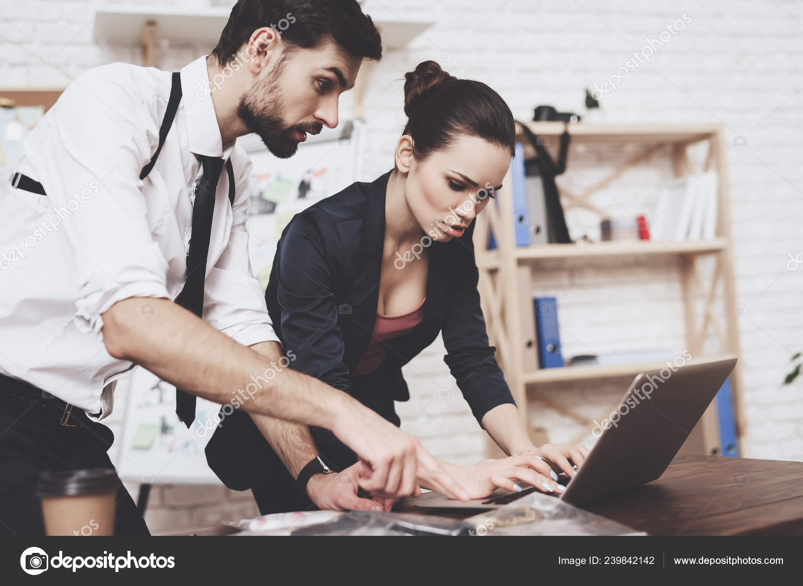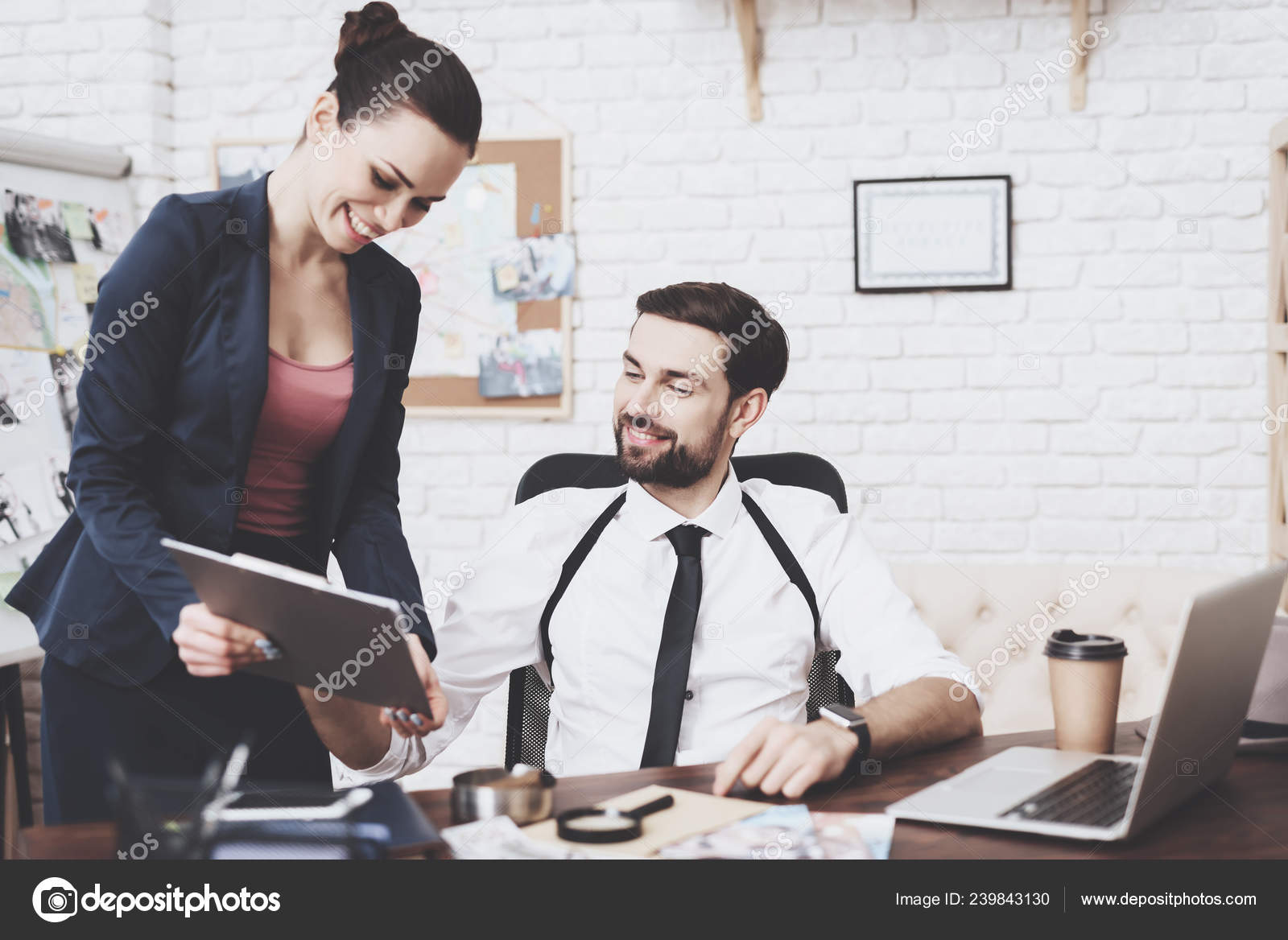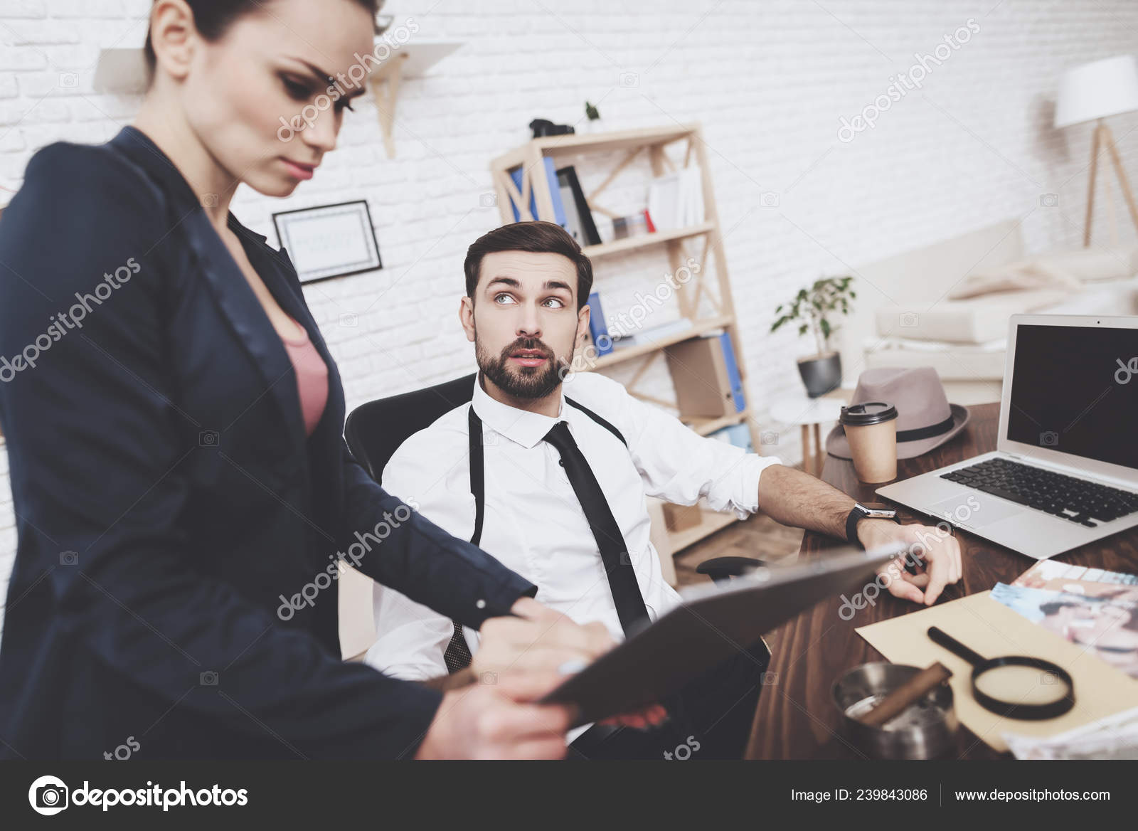 Private Detective Agency Man And Woman Are Looking At Clues On Laptop Stock Photo C Stockveres Gmail Com