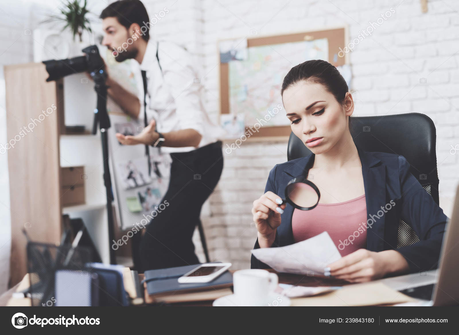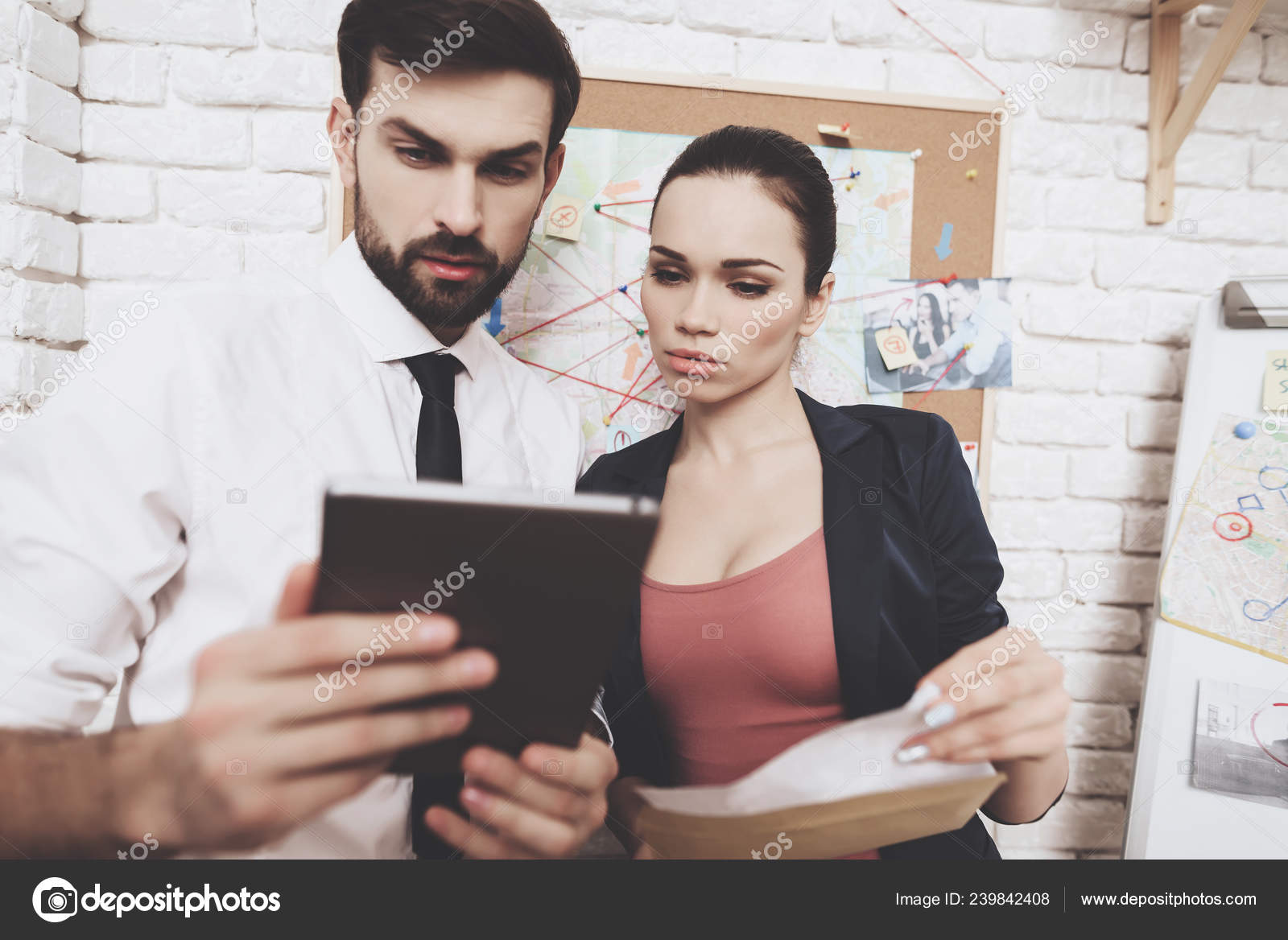 Private Detective Agency Man And Woman Are Looking At Clues On Tablet In Office Stock Photo C Stockveres Gmail Com