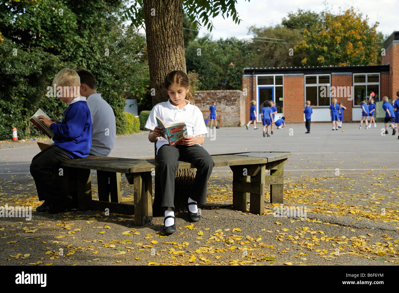 Scolari La Lettura Di Libri Durante La Ricreazione In Un Inglese Scuola Primaria Parco Giochi Foto Stock Alamy