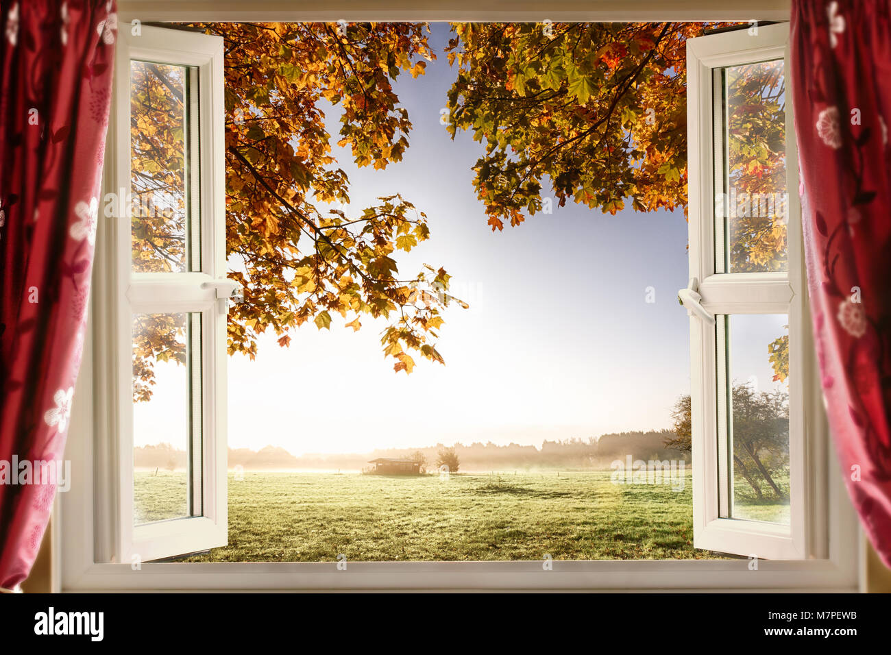 Aprire La Finestra Con Aria Fresca E Uno Scenario Paesaggistico Viste Tende Rosse Aperto Visualizza Una Finestra Moderna In Una Casa In Una Posizione Rurale Foto Stock Alamy