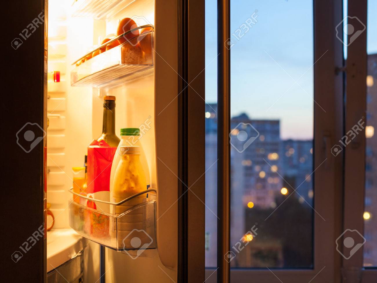 Immagini Stock Aprire Lo Sportello Del Frigorifero Con Il Cibo E La Vista Della Citta Attraverso La Finestra Di Casa In Serata Image
