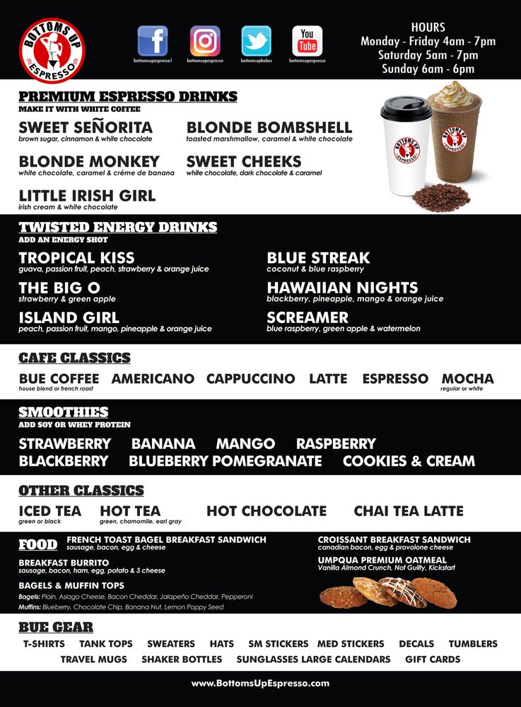 4.4 - 26 votes. Delivery & Pickup Options - 38 reviews of Bottoms Up Espresso "Small out of the way location (the others are usually a little closer to the freeway and whatnot). 5:00 am - 7:00 pm.