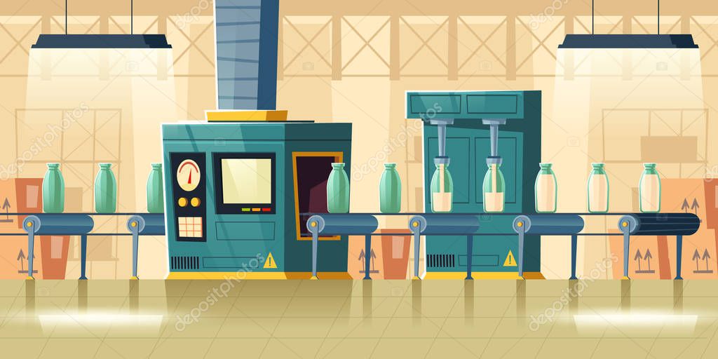 Milk Factory Interior Glass Bottles On Conveyor Belt Cartoon Vector Illustration Plant Room With Moving Production Line And Glass Packaging For Dairy Products On It Milk Manufacture Background Premium Vector In