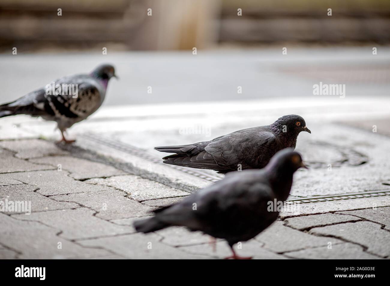Piccioni In Citta Quello Centrale A Fuoco Gli Altri Due Fuori Fuoco Camminando Su Ciottoli Foto Stock Alamy