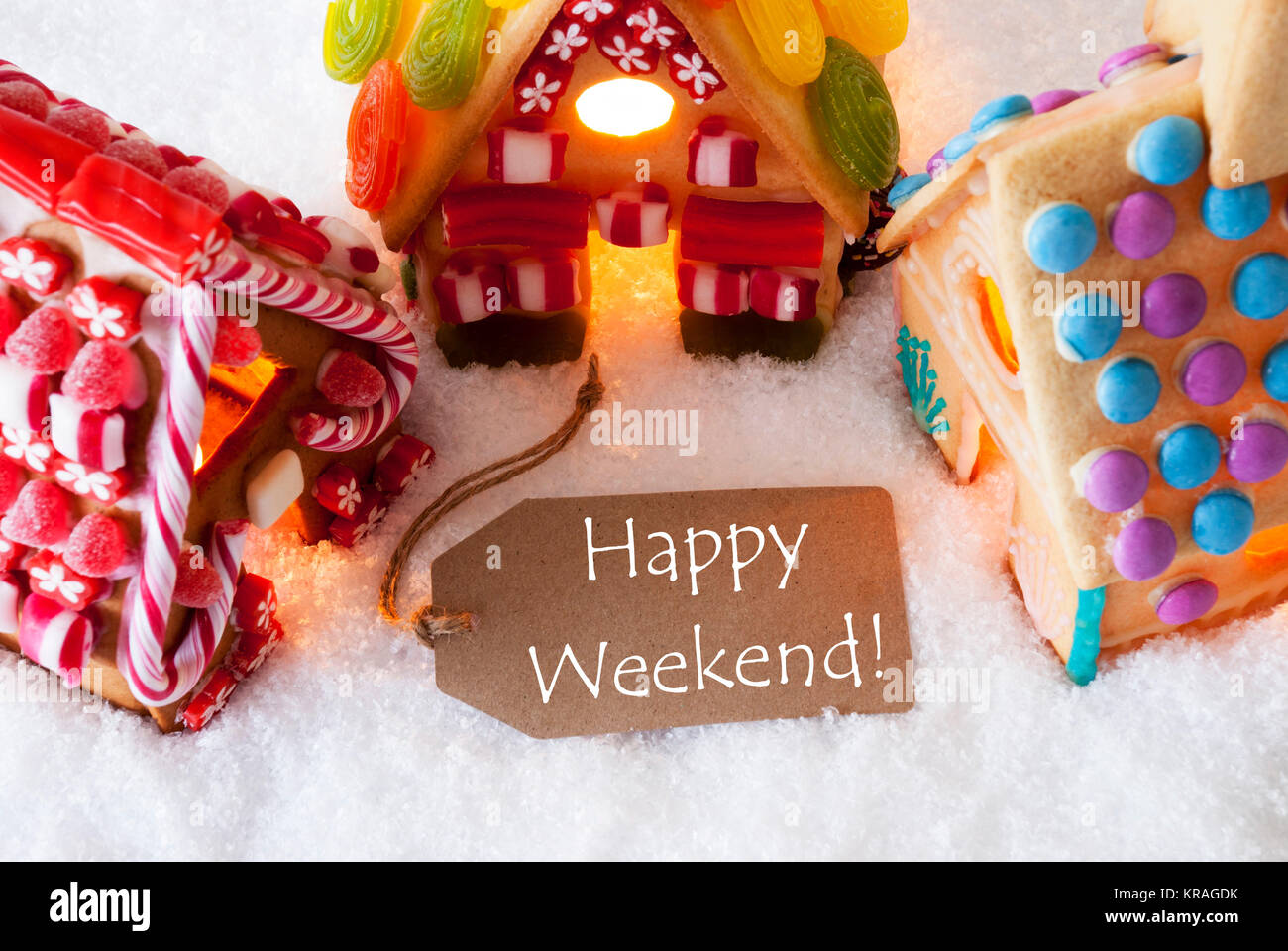 Etichetta Con Testo In Inglese Happy Weekend Coloratissima Casa Di Panpepato Sulla Neve Scheda Di Natale Per I Migliori Auguri Di Buon Natale Foto Stock Alamy