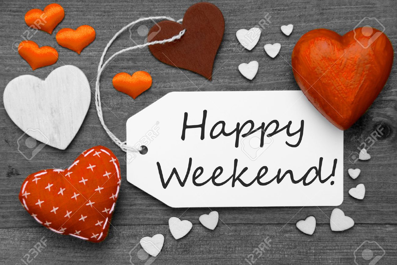 Immagini Stock Etichetta Con Orange Textile Cuori Su Sfondo Grigio Di Legno Happy Weekend Inglese Testo Retro O Vintage Stile In Bianco E Nero Con Colorata Hot Spot Image