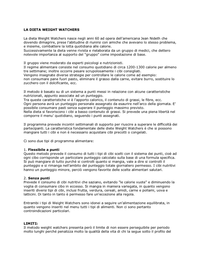 The Weight Watchers diet aims to restrict energy to achieve a weight loss of 05 to 10 kg per week, which is the medically accepted standard rate of a viable weight loss strategy The dietary composition is akin to lowfat diets or moderatefat and lowcarbohydrate diet depending on the variant used Contrary to several other diets, Weight Watchers does not focus on the calories but simplify food selection with a pointsbased system named "SmartPoints", where each food type is assigned a. La dieta Weight Watchers è ed è stata molto in voga, con alterne fortune Ne esistono diverse versioni lineapunti, flexipoints, propoints e forse altre varianti ancora Io ho seguito la lineapunti per un periodo in modo scrupoloso, mentre al momento mantengo il conto dei punti per avere un'idea di quanto ingerisco, ma non sono più precisa e. Review Summary WW (Weight Watchers) is a safe and effective way to improve your health and.