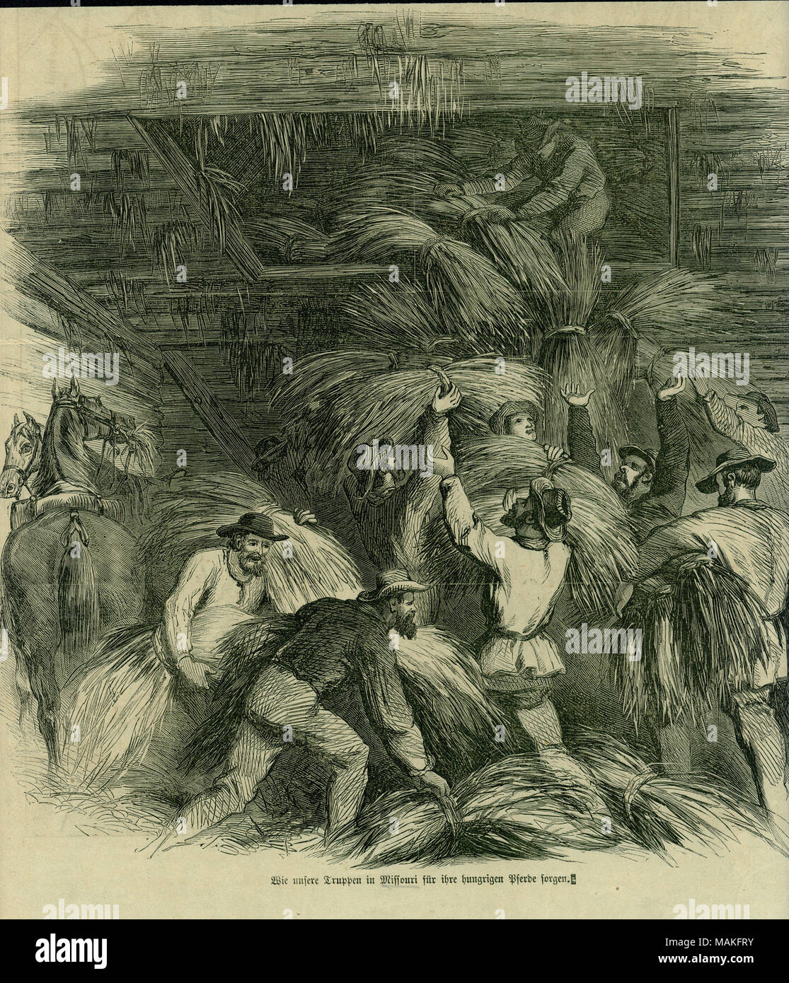 Una Guerra Civile Ser Stampa Di Uomini Tenendo Fasci Di Fieno Dal Soppalco In Un Granaio