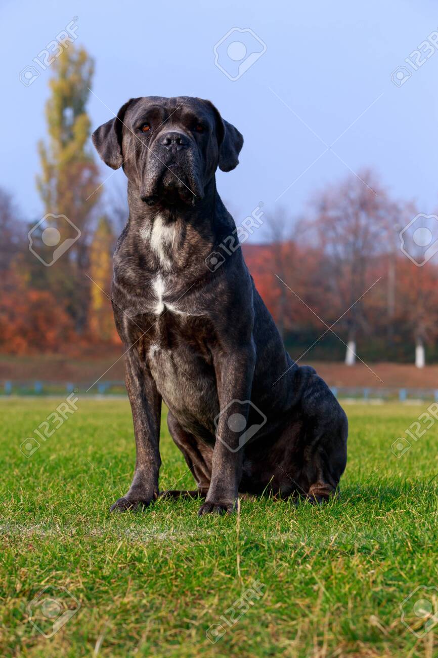 Cane Corso Italiano Dog Walking In Park In Autumn Stock Photo Alamy