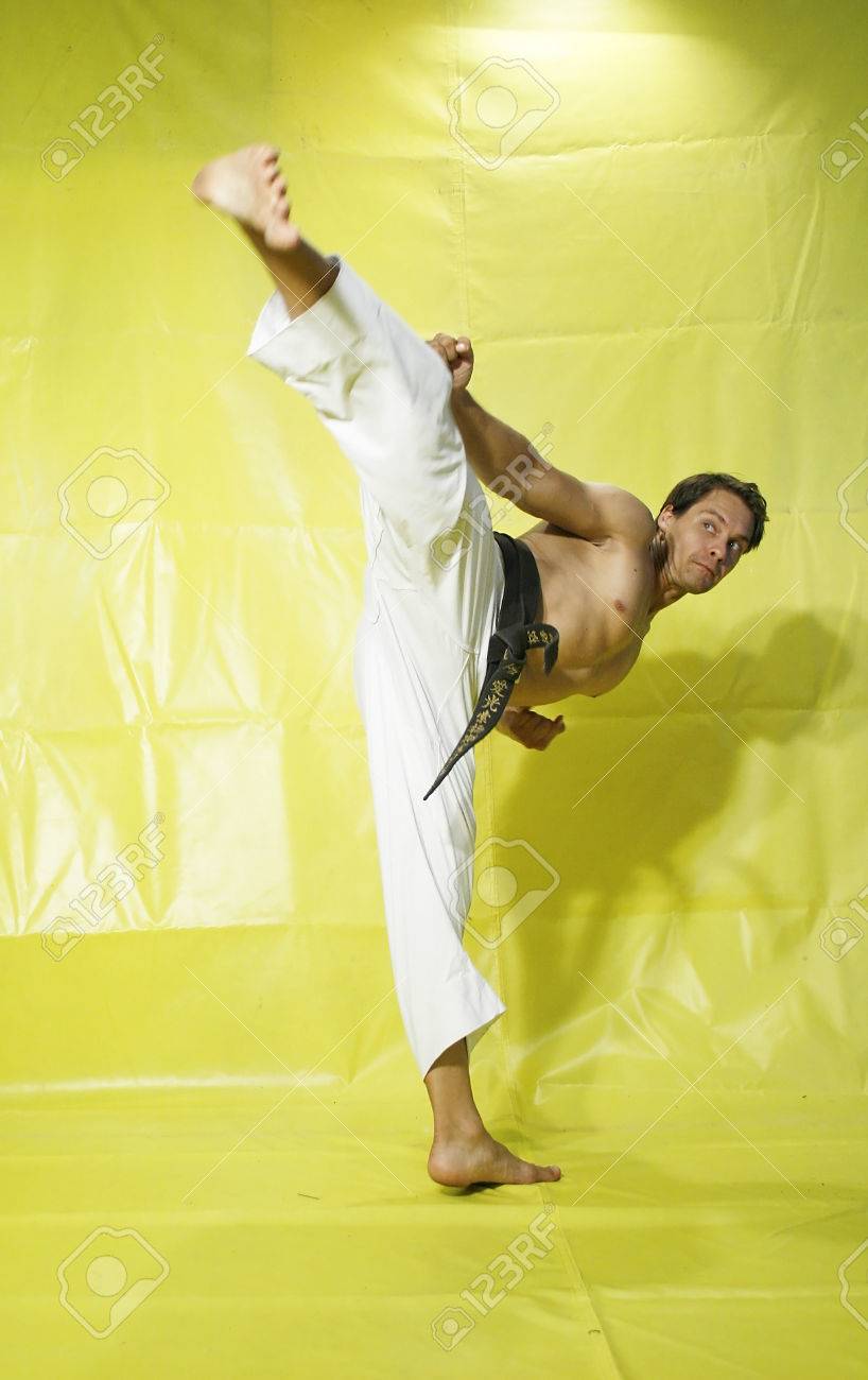 Immagini Stock Te Kwon Do Maestro Di Arti Marziali Cintura Nera Fa Perfetto Calcio Di Lato Alto Image