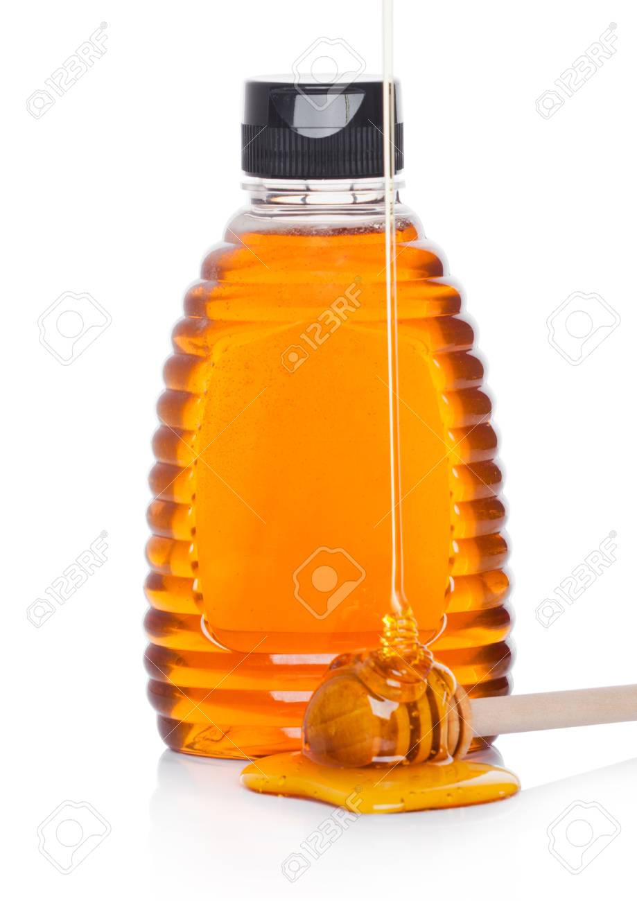 Immagini Stock Bottiglia Di Plastica Del Barattolo Con Miele Naturale Organico Con Il Bastone E Miele Liquido Su Fondo Bianco Image