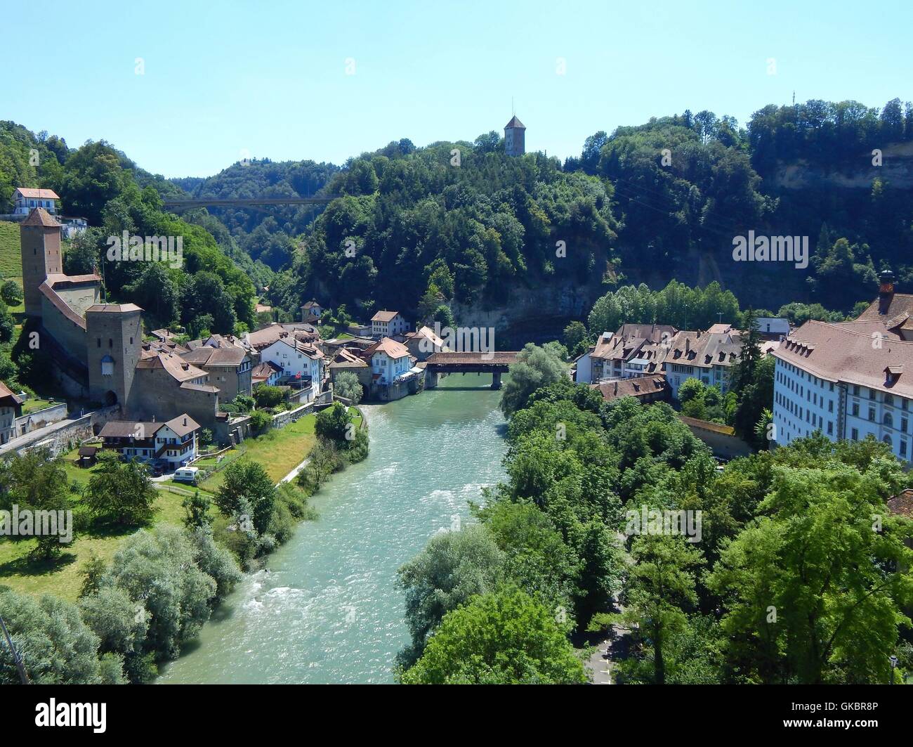 Panorama Della Citta Vecchia Di Friburgo In Svizzera Con La Sarine Fiume In Primo Piano E Di Difesa Medievali In Background Foto Stock Alamy