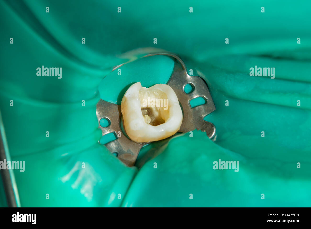 Closeup Umana Trattata Con Dente In Un Riempimento Dentale Clinica Marcio Pulizia E Canali Con L Uso Della Diga Di Gomma Sistema Di Tenuta E Staging Foto Stock Alamy