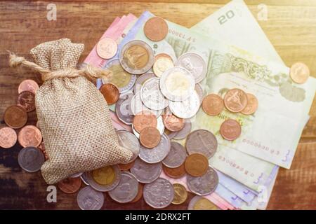 Salvataggio Il Concetto Di Investimento Moneybag Su Molti Soldi Monete E Banconote Sul Tavolo Di Legno Il Risultato Del Risparmio Per Il Futuro Con Spazio Per Il Testo Foto Stock Alamy