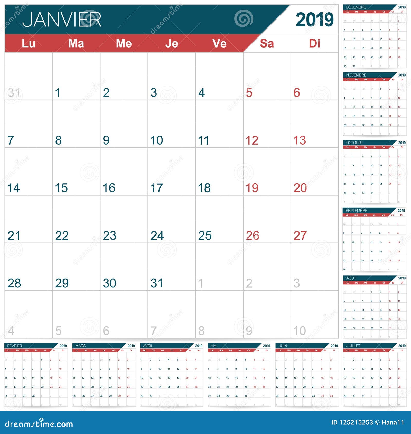 Calendario Francese Per L Anno 19 Illustrazione Vettoriale Illustrazione Di Francese Calendario