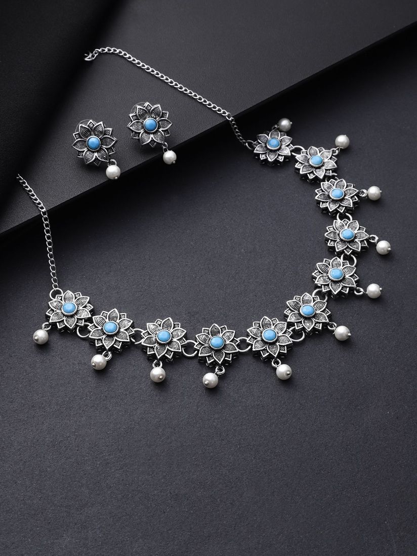 Priyaasi Jewellery Sets Buy Priyaasi Silver Plated Blue Stones Studded Floral Necklace With Earrings Online Nykaa Fashion