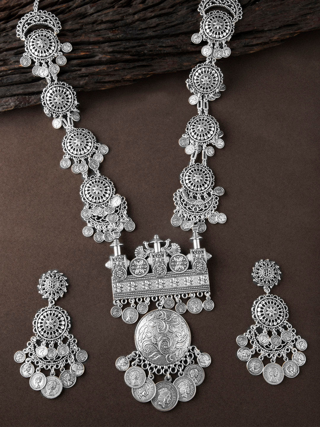 Indu Goddess Antique Silver Plated Statement Necklace Earring Set At 4550 Azilaa